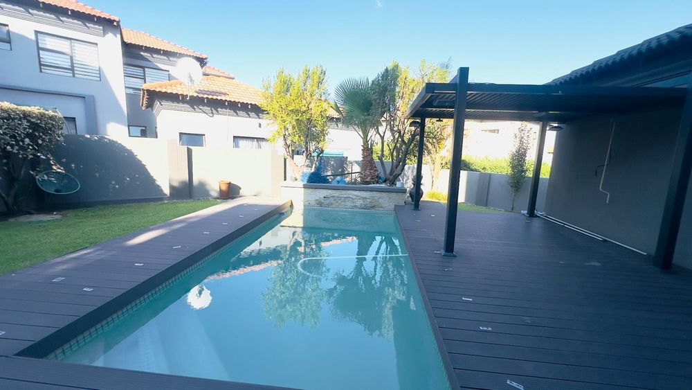 # Sparkling swimming pool with elegant decking, water feature, and pergola
