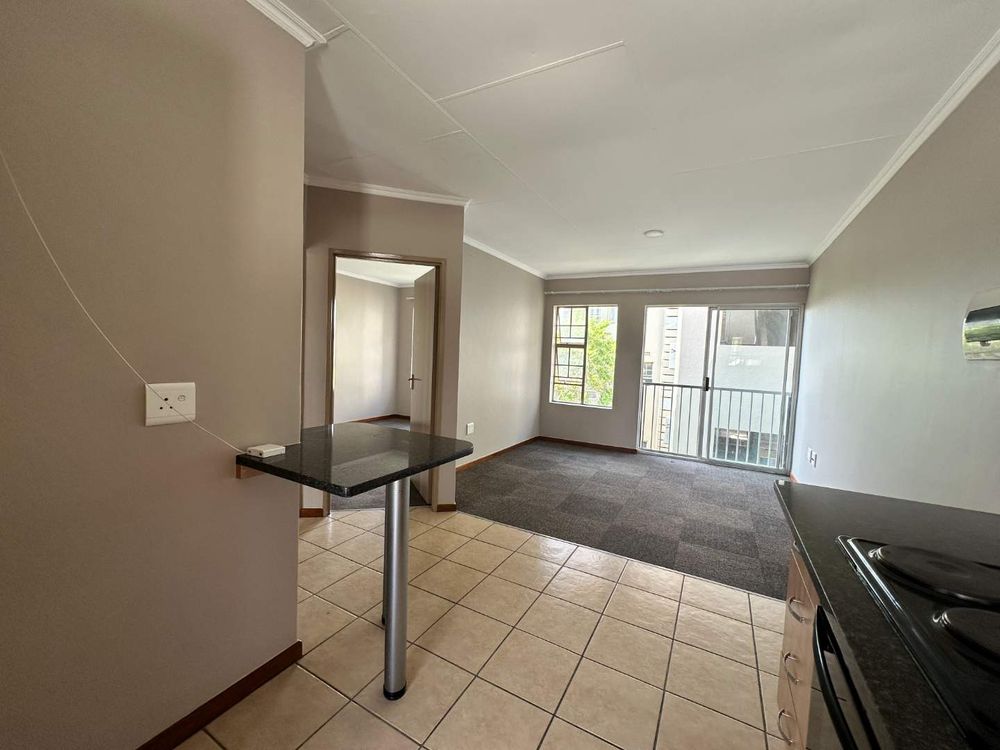 The apartment features a bright open-plan kitchen and living area, designed for easy everyday living. The kitchen includes ample cupboard space and a convenient breakfast counter, while the living area opens onto a private balcony—perfect for relaxing or unwinding.