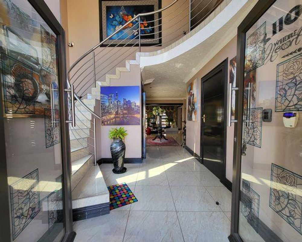 Entrance Hall: Stunning staircase with floor-to-ceiling windows for abundant natural light.