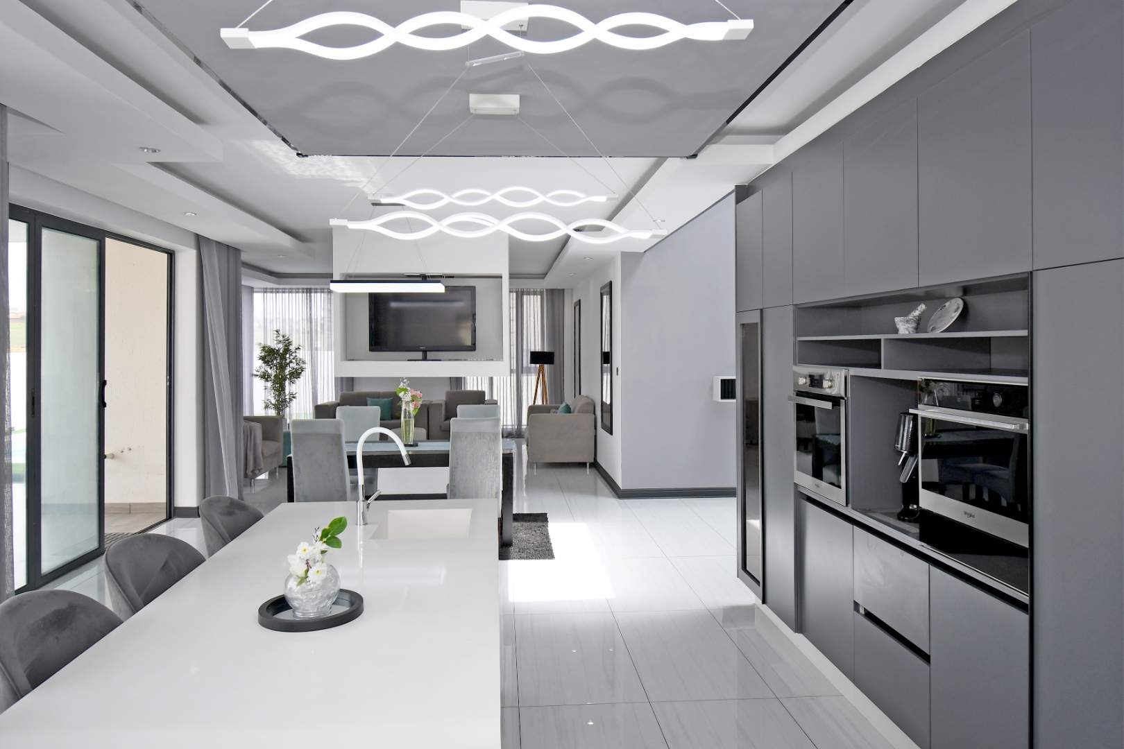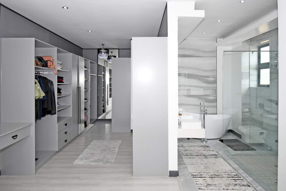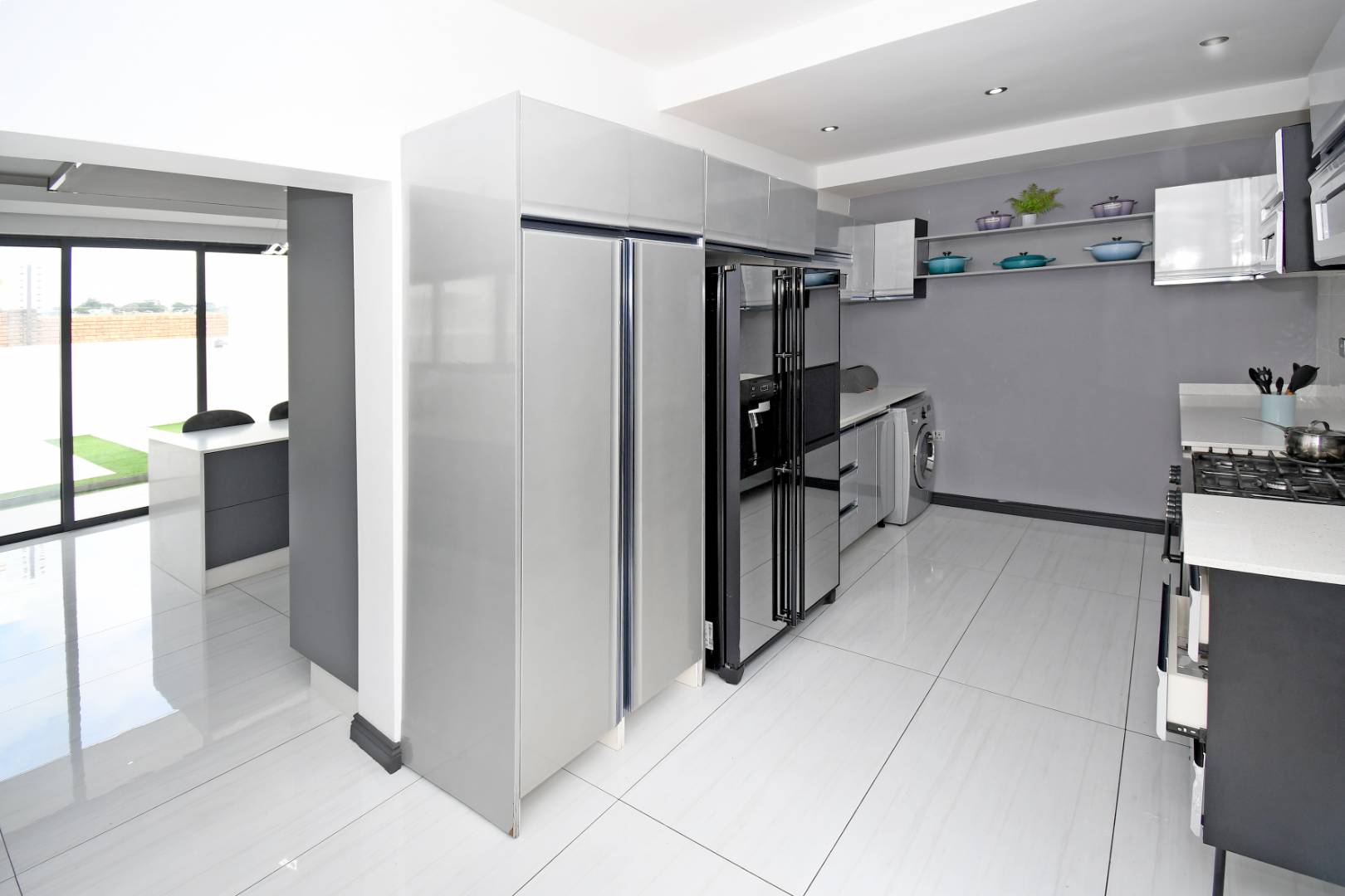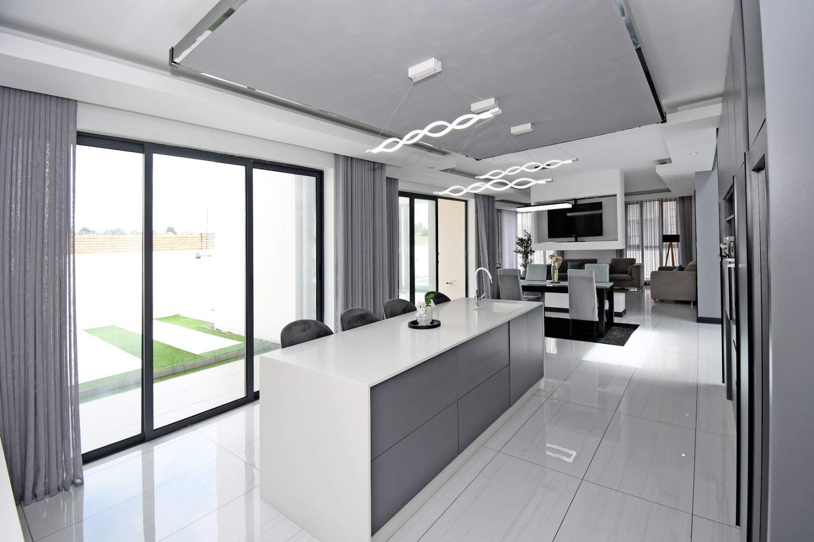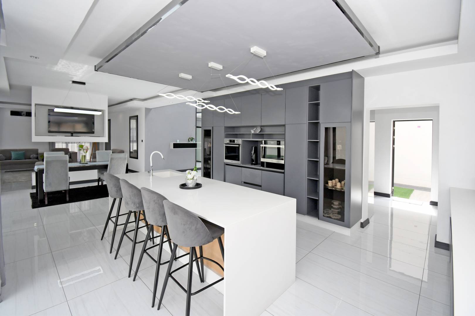 Designed for seamless living, the open-plan areas flow effortlessly into a state-of-the-art modern kitchen with high-end finishes, sleek high-gloss cupboards, and a massive scullery.