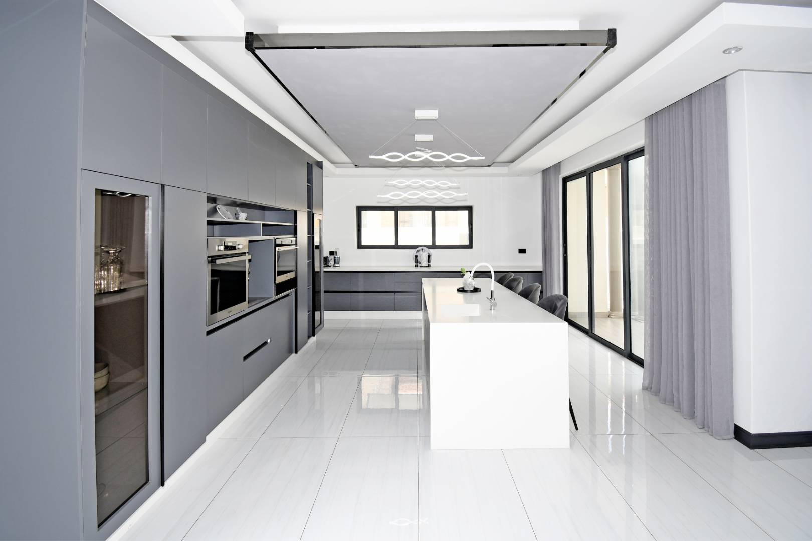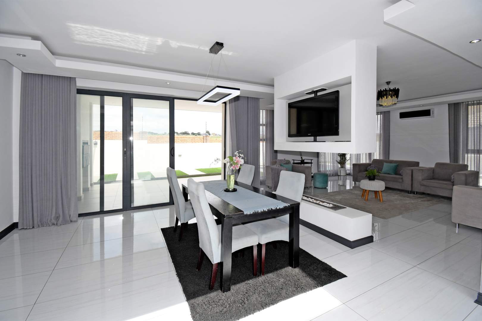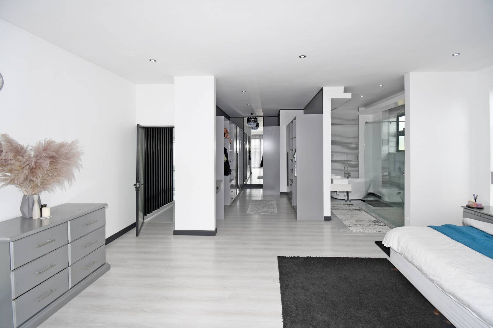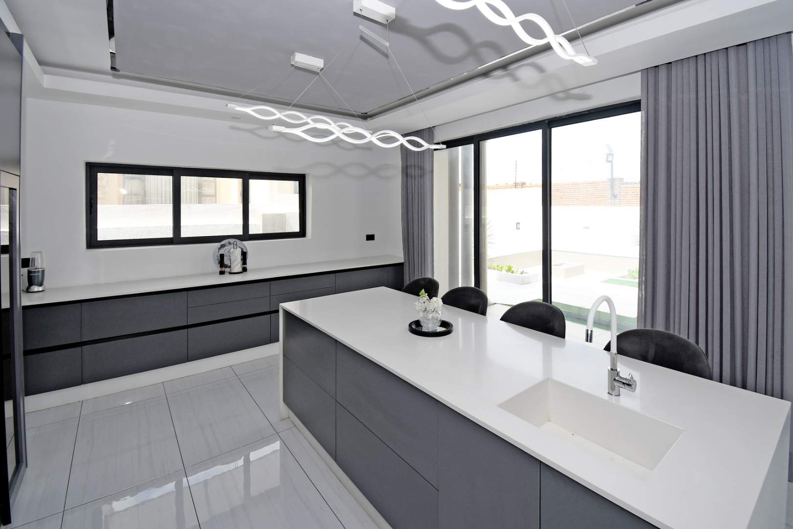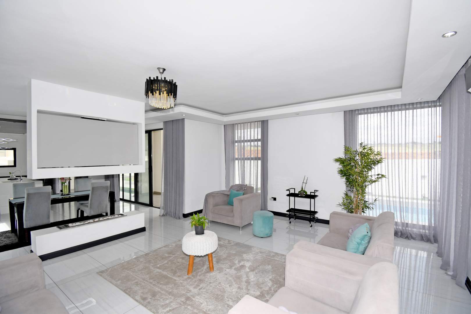Designed for seamless living, the open-plan areas flow effortlessly into a state-of-the-art modern kitchen with high-end finishes, sleek high-gloss cupboards, and a massive scullery.