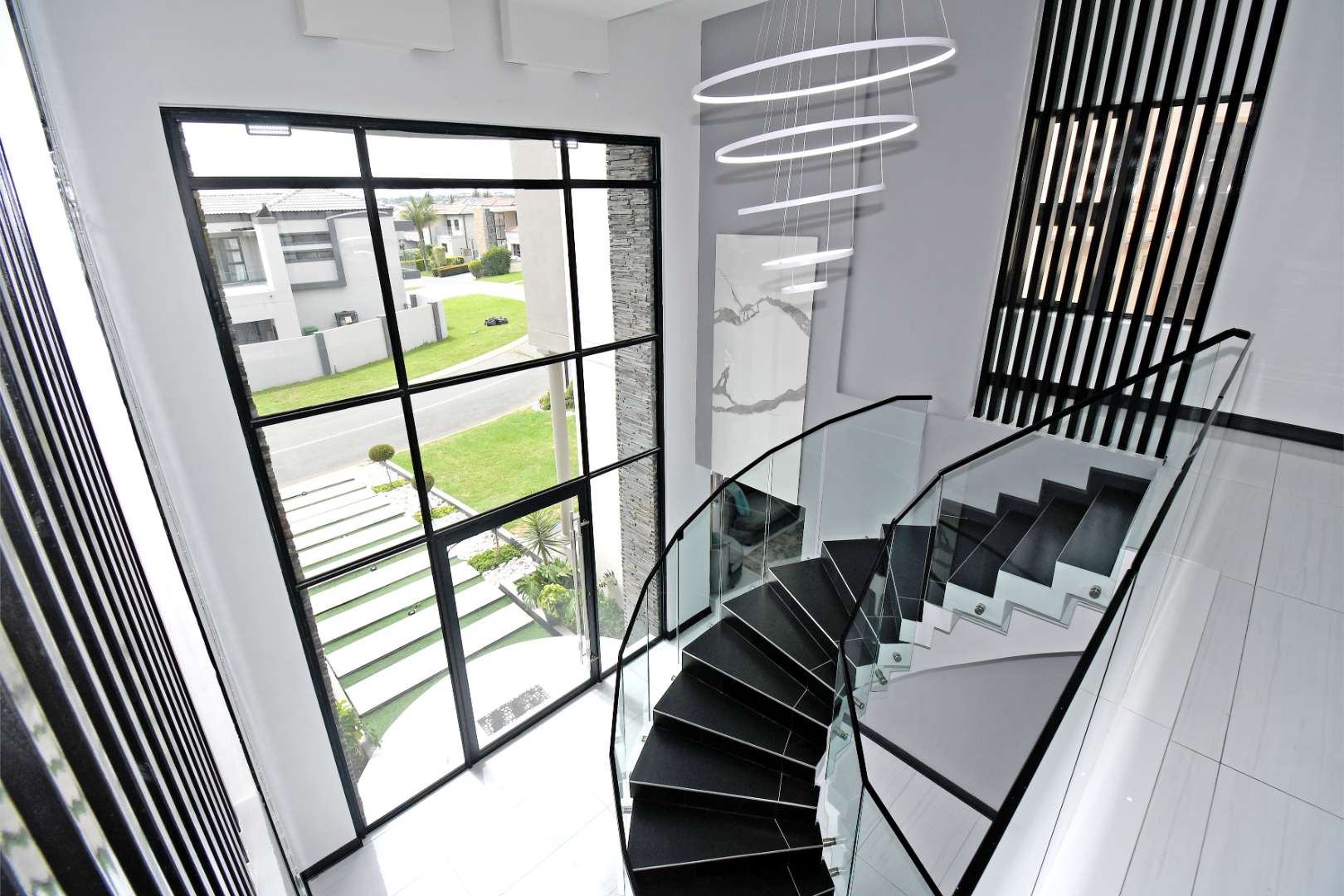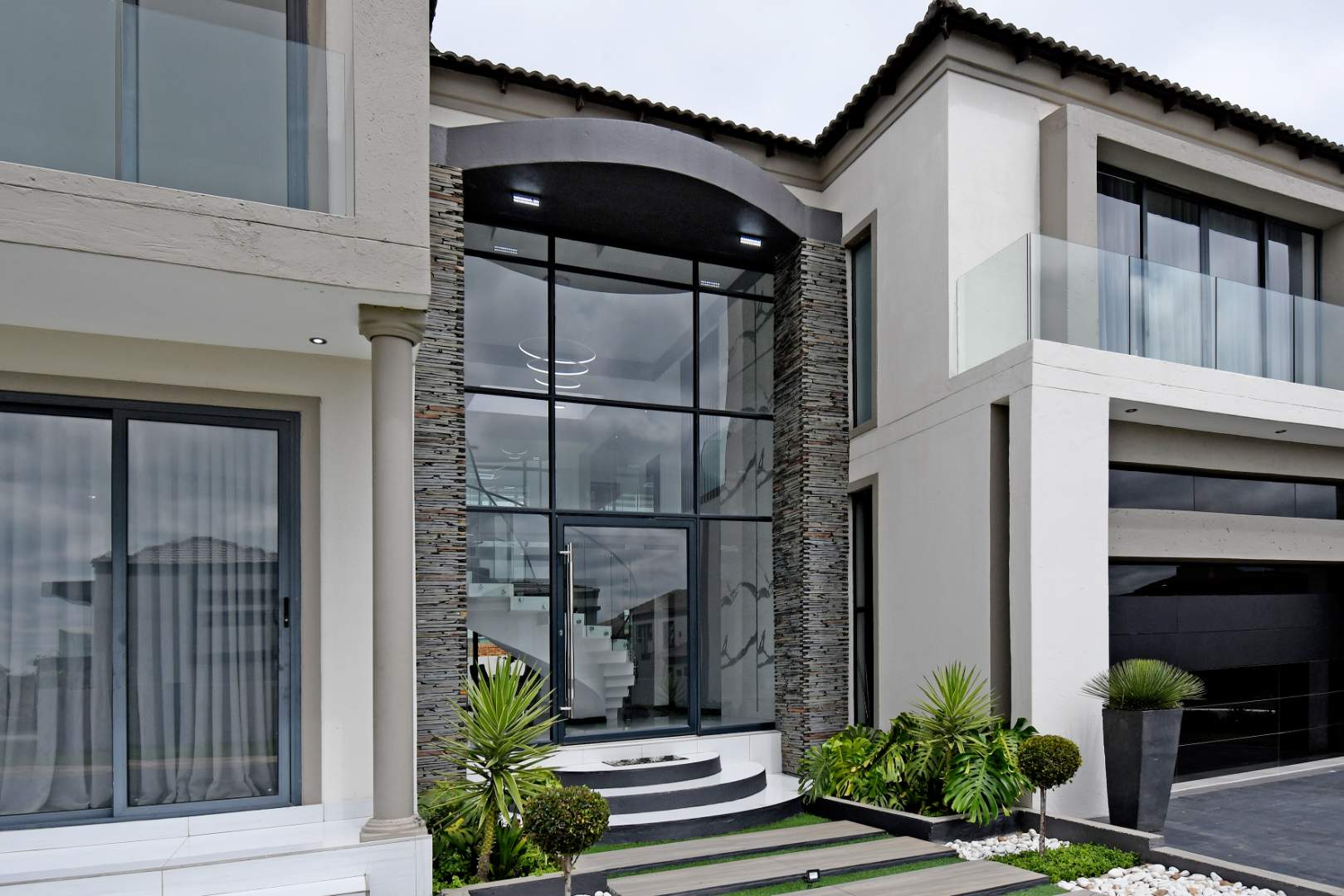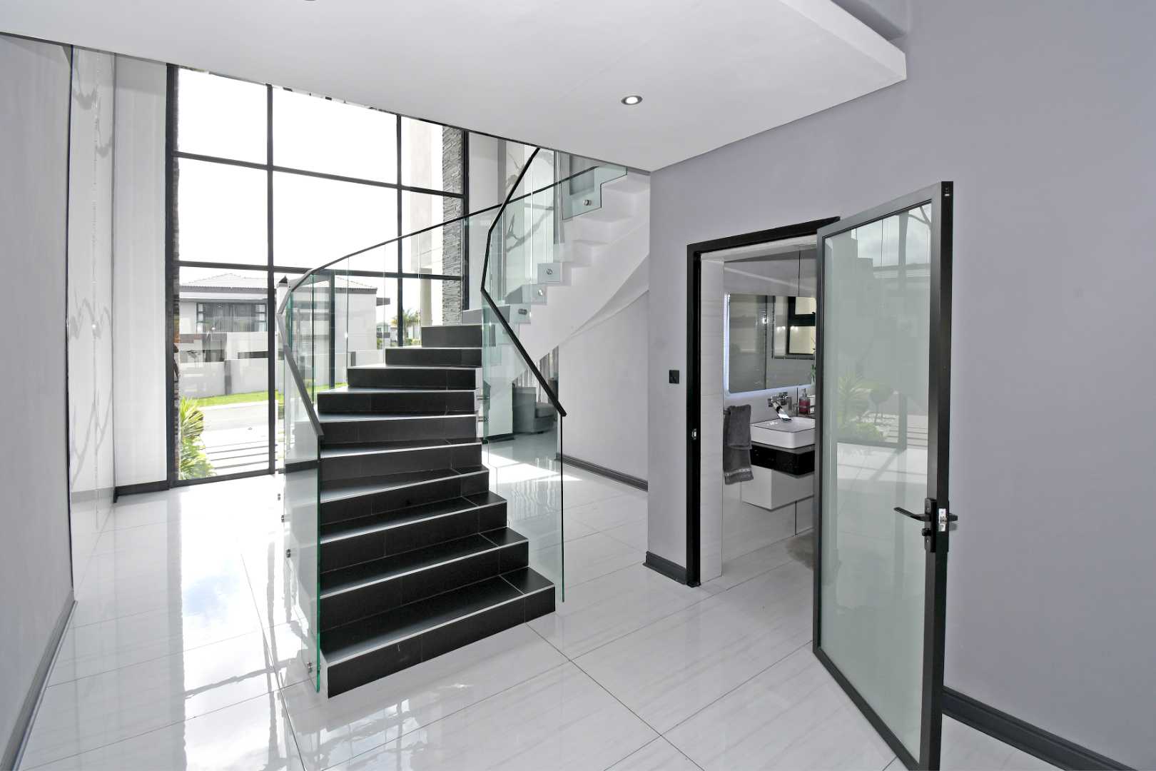 This breathtaking modern home makes an unforgettable first impression with its beautifully designed front façade and grand glass entrance doors. Inside, soaring high ceilings and expansive living spaces create an atmosphere of sophistication and luxury.