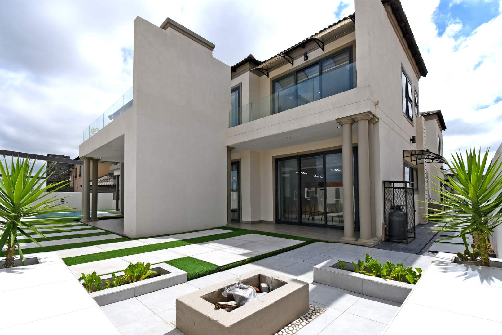 Perfect for entertaining, the outdoor area includes a covered patio with a built-in braai, a fire pit, and a stunning wrap-around pool, offering the ultimate indoor-outdoor lifestyle.