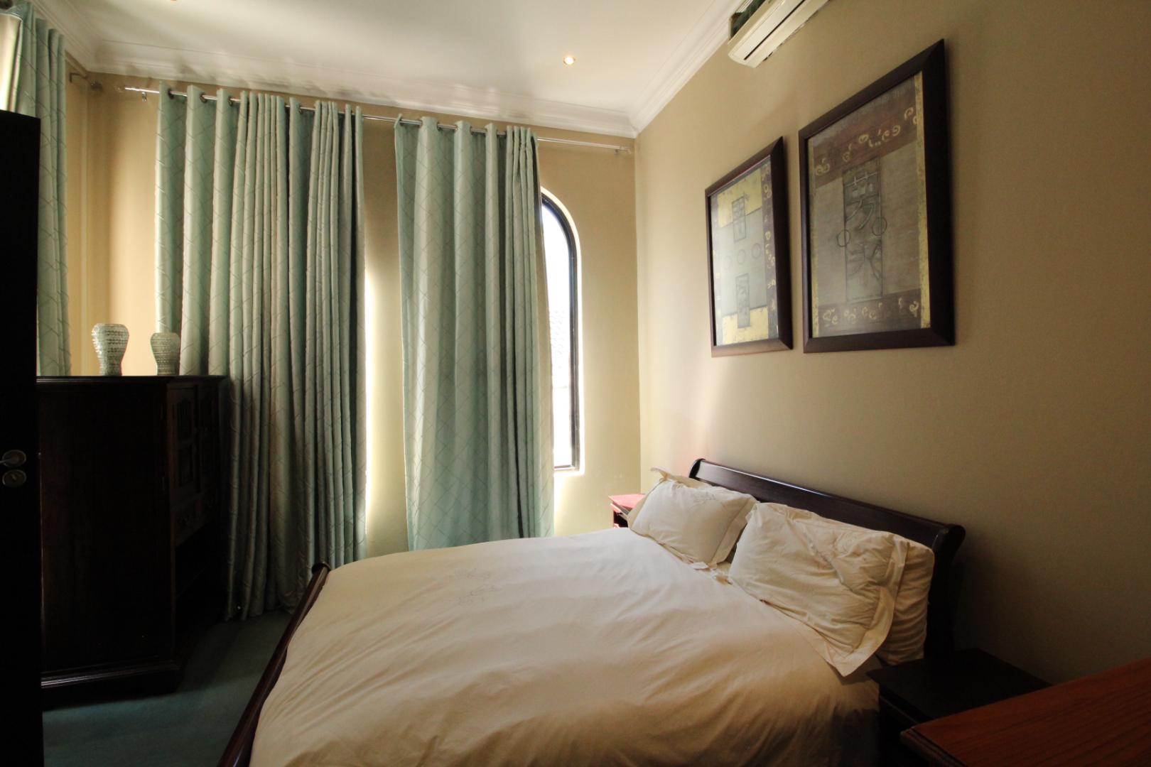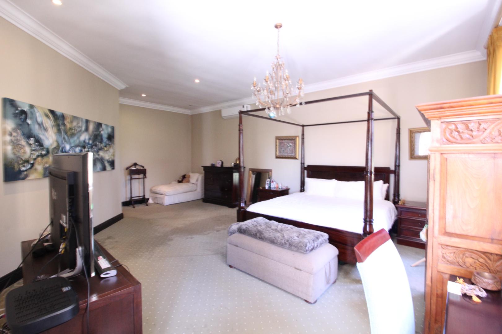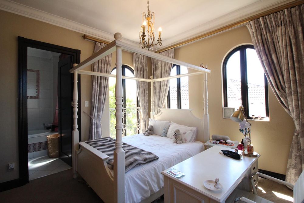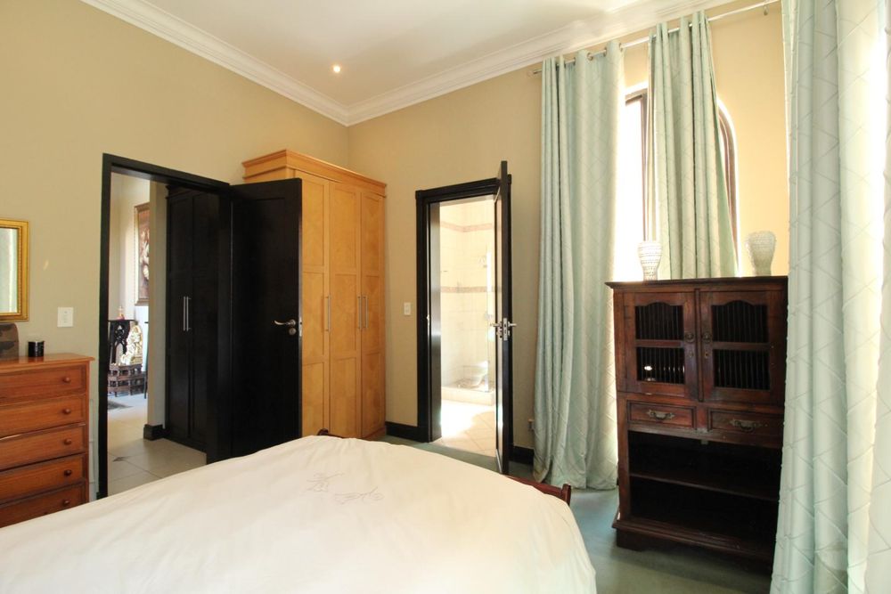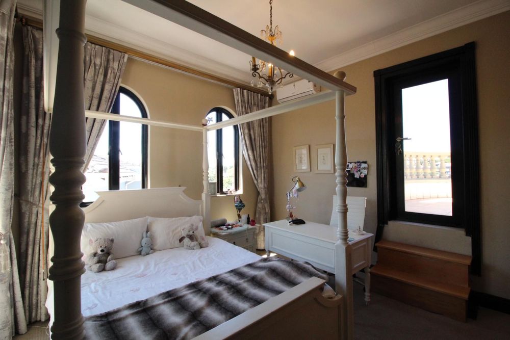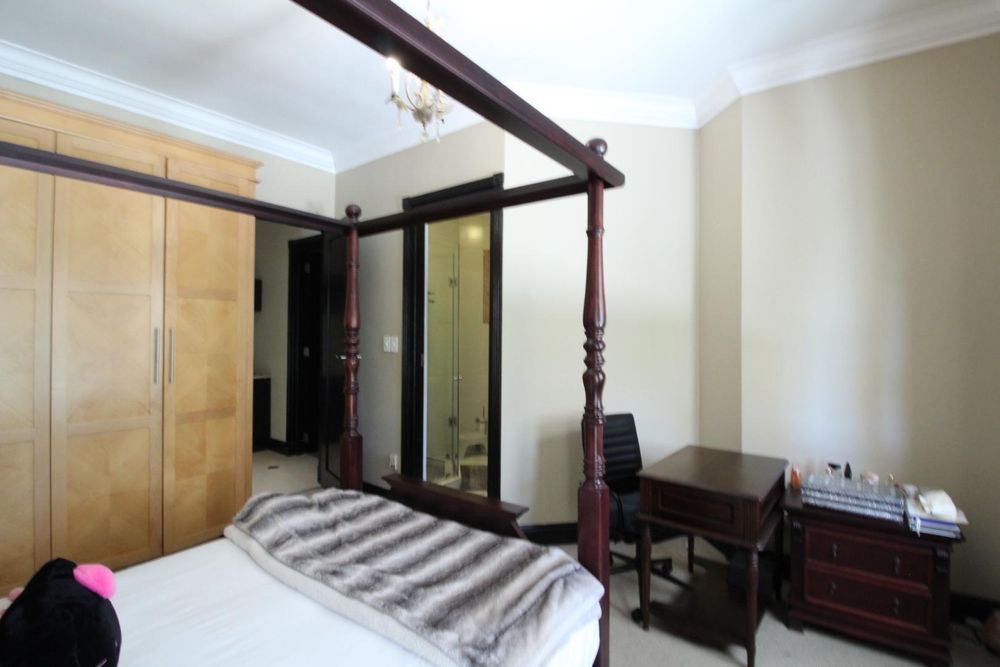 Upstairs, the luxurious master suite offers a private sanctuary with plush carpeting, a walk-in dressing room, generous built-in cupboards, and a spacious en-suite bathroom. The bedroom also enjoys access to a shared balcony, offering peaceful views across the estate.