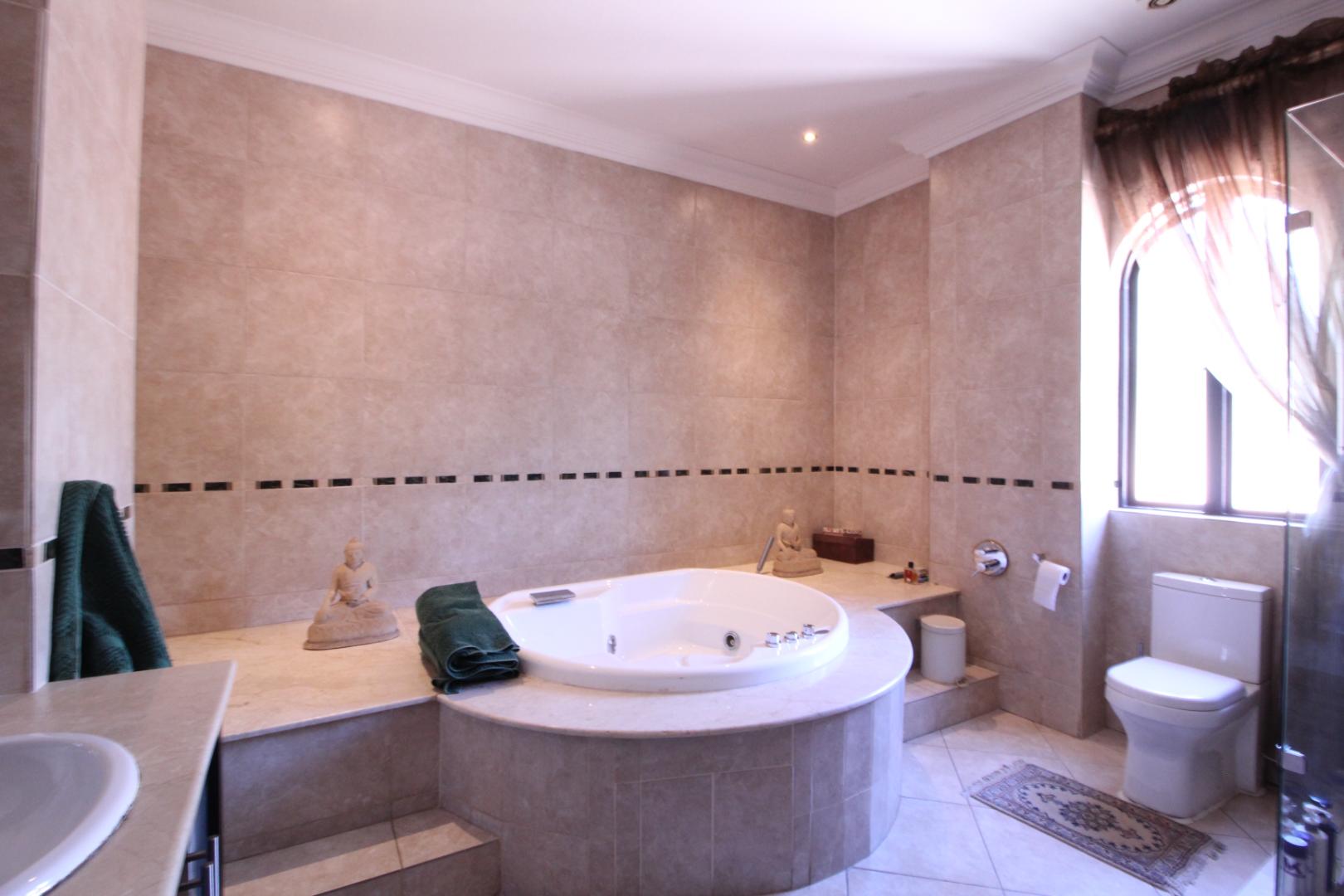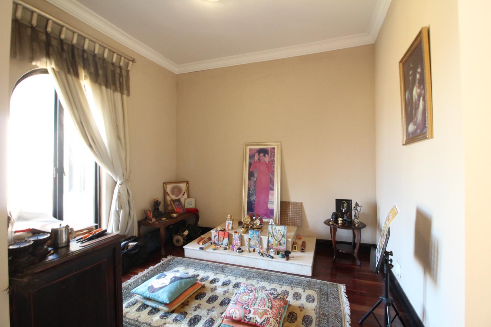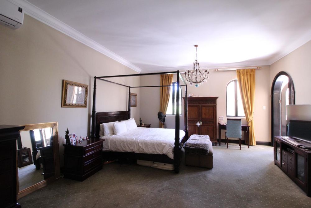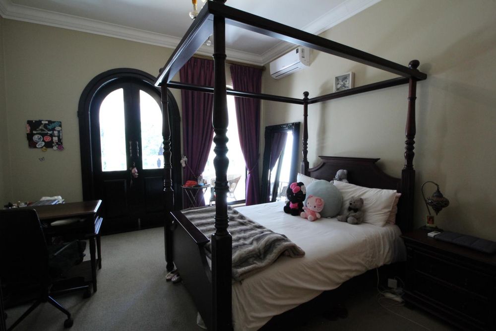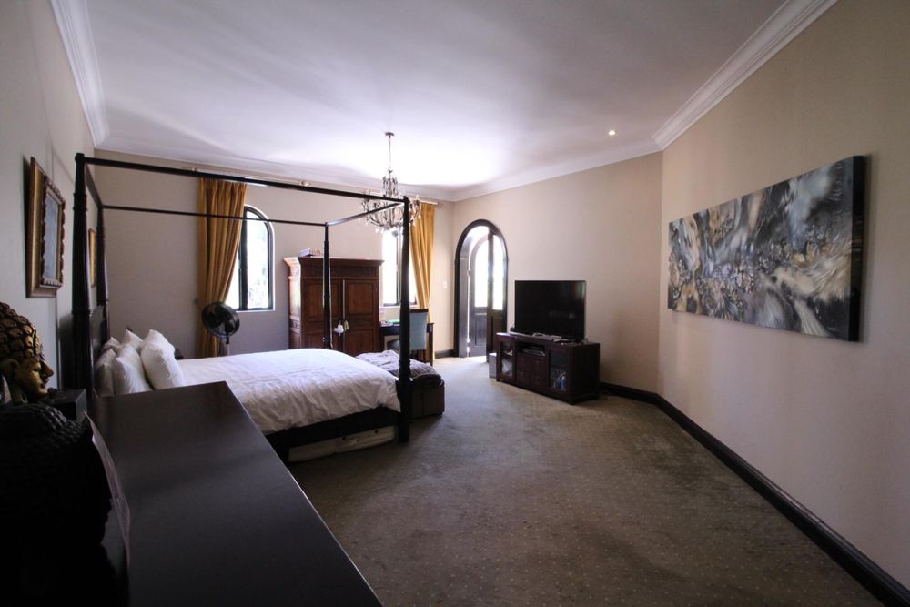 Upstairs, the luxurious master suite offers a private sanctuary with plush carpeting, a walk-in dressing room, generous built-in cupboards, and a spacious en-suite bathroom. The bedroom also enjoys access to a shared balcony, offering peaceful views across the estate.