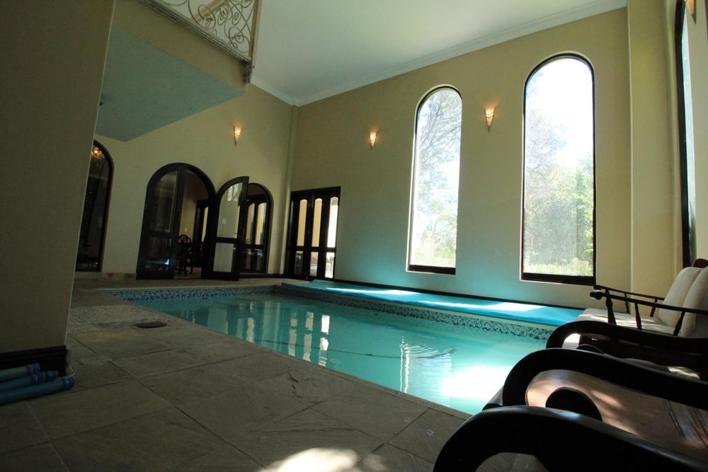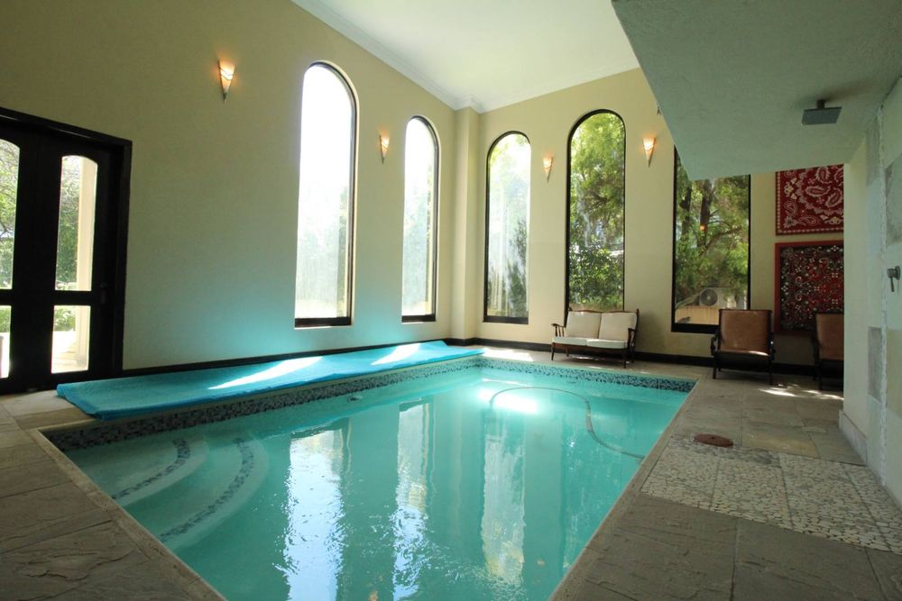 A standout feature is the heated indoor swimming pool, positioned alongside large windows that flood the space with natural light and open onto the veranda and garden. This unique feature allows for year-round enjoyment while overlooking the beautifully landscaped garden.