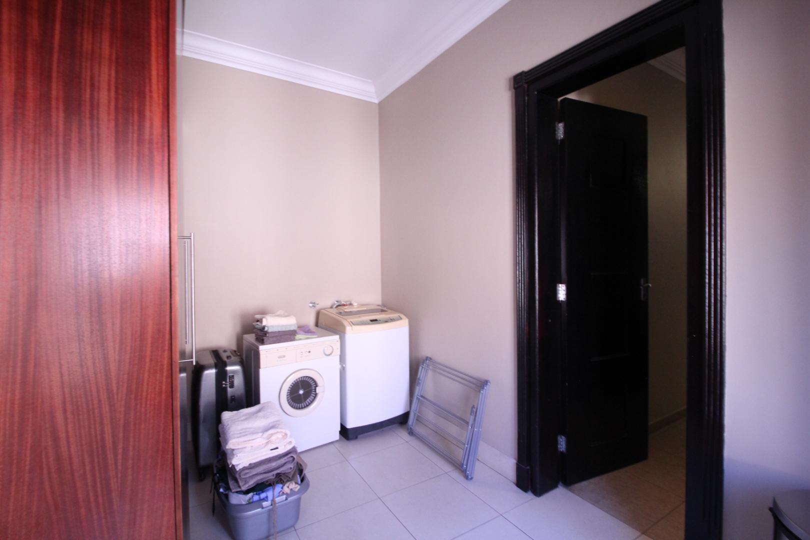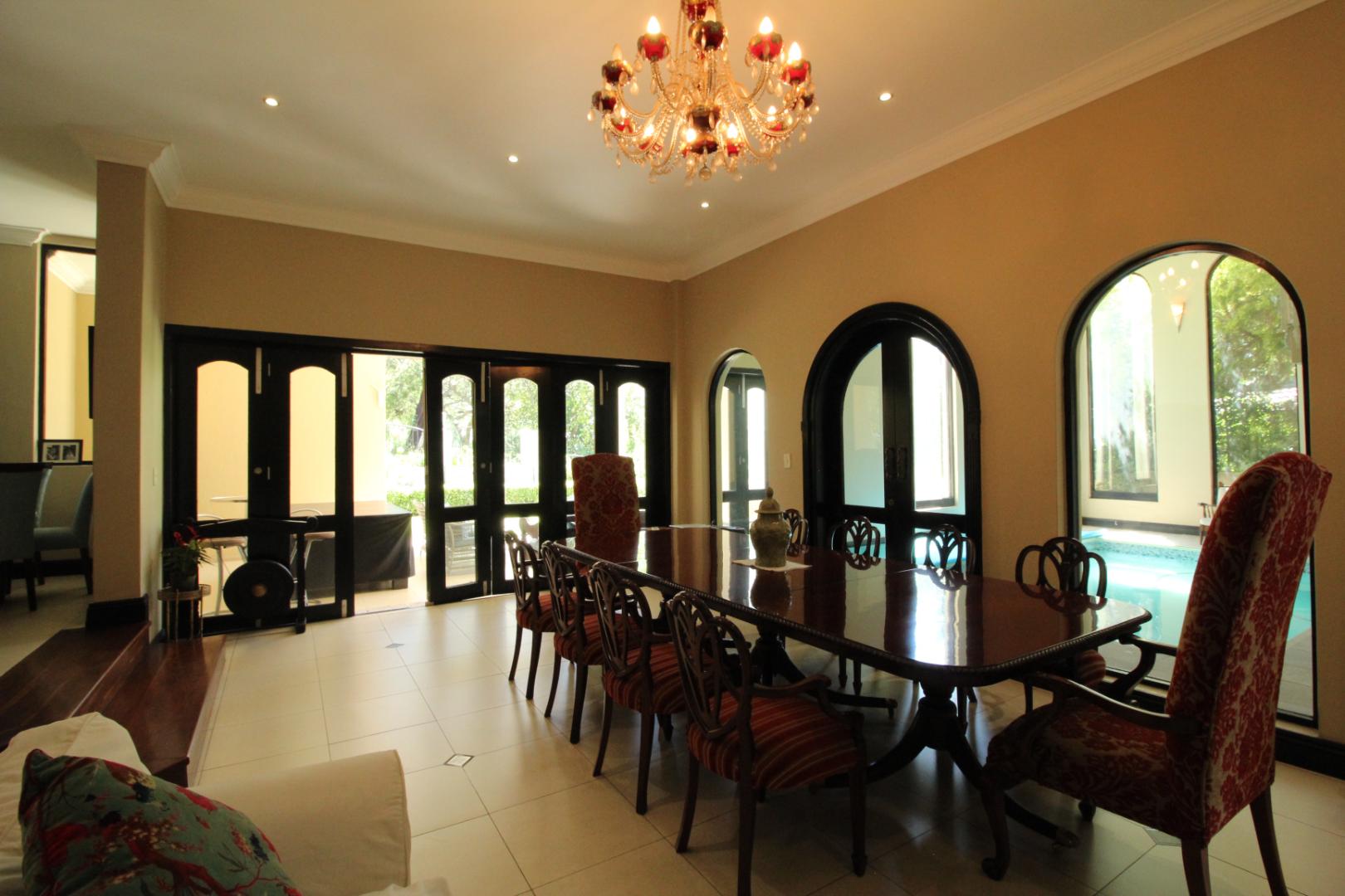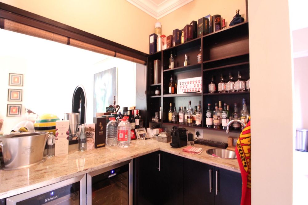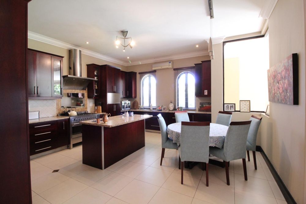 The modern kitchen is both stylish and functional, featuring built-in appliances, generous cupboard space, a central island, and a separate scullery, with a casual dining area ideal for everyday family meals.