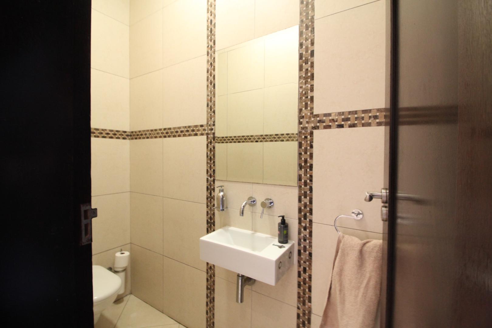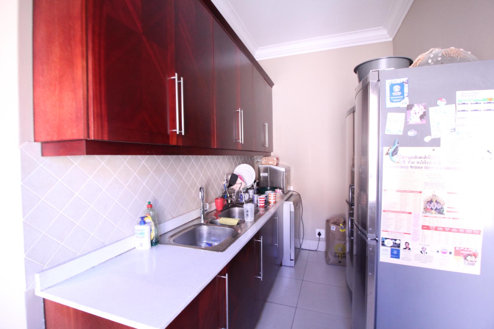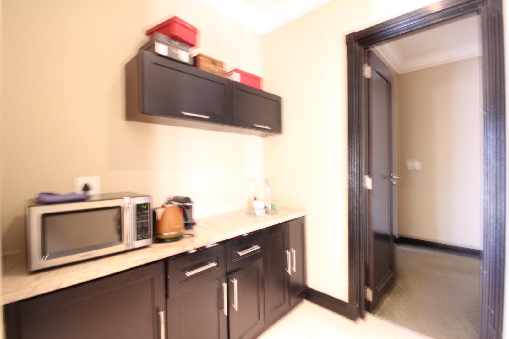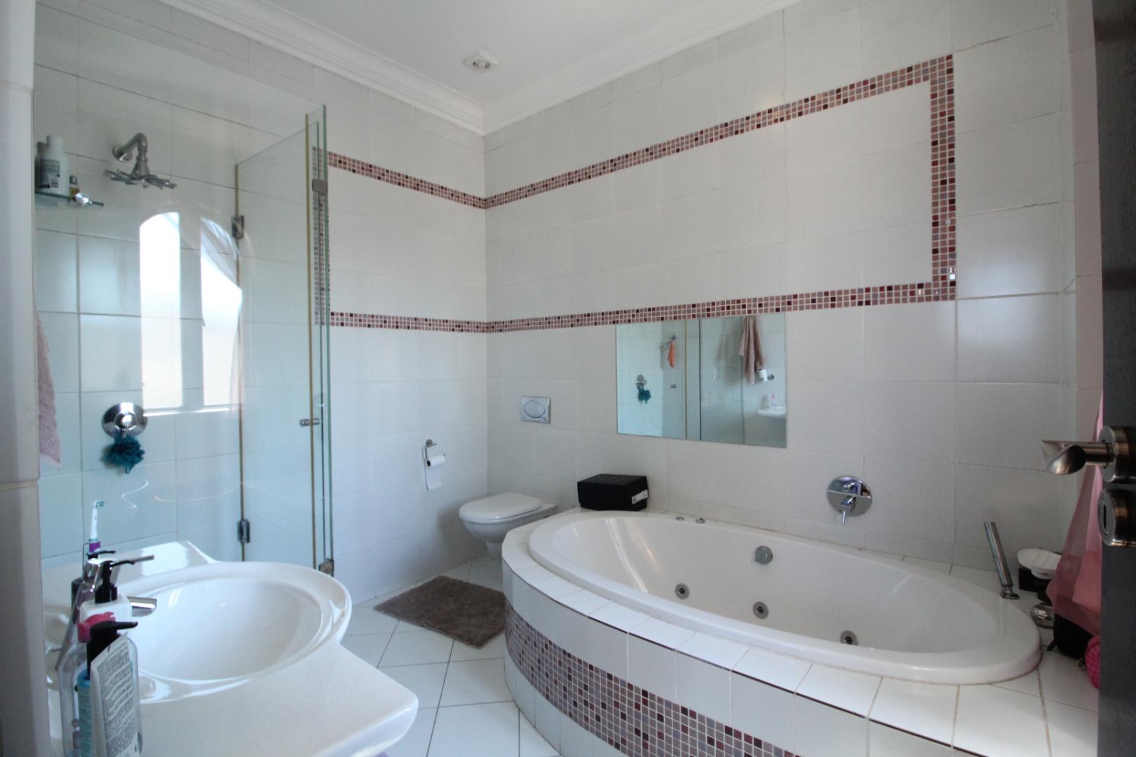 The modern kitchen is both stylish and functional, featuring built-in appliances, generous cupboard space, a central island, and a separate scullery, with a casual dining area ideal for everyday family meals.