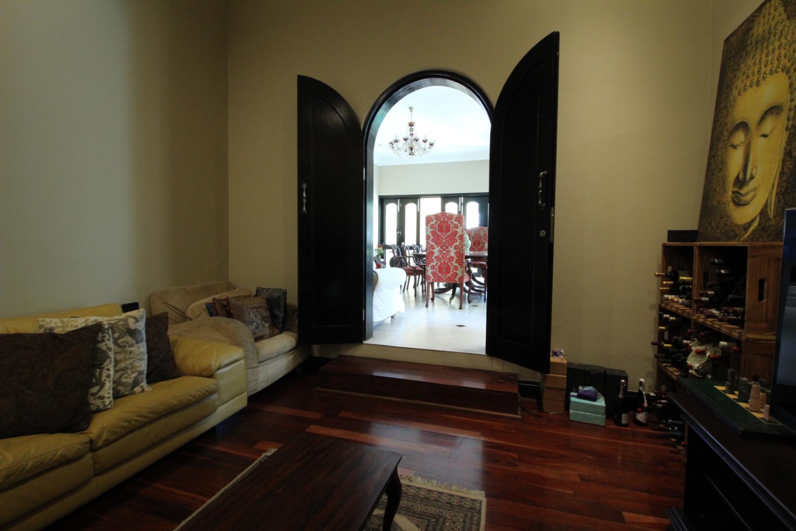 The home makes a striking first impression with its grand towers, arched windows, expansive verandas, and impressive double-volume entrance hall, complemented by high ceilings and refined finishes throughout. Polished timber flooring and classic architectural detailing add warmth and timeless character to the living spaces.