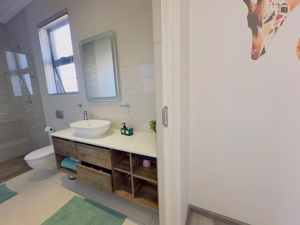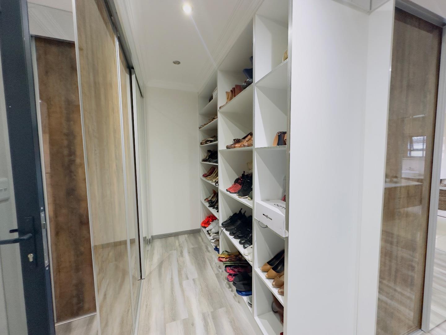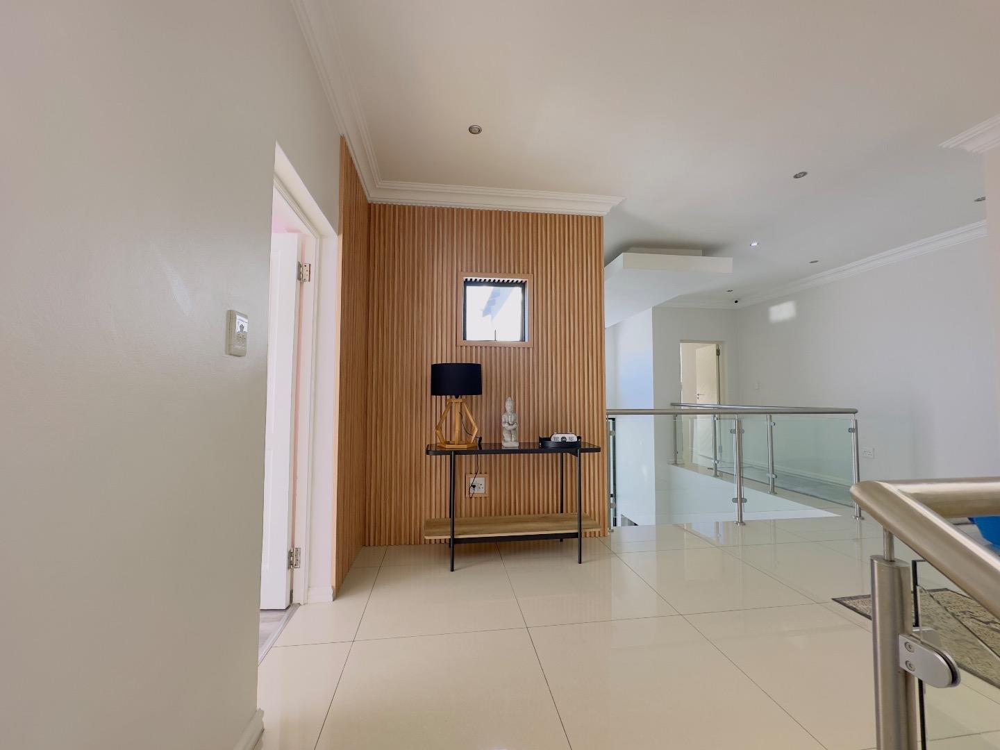 The property is designed for lifestyle living and effortless entertaining. Enjoy a covered patio with built-in braai, overlooking a sparkling swimming pool fitted with a heat pump, surrounded by a beautifully landscaped garden. An upstairs balcony provides an additional tranquil retreat with elevated estate views.