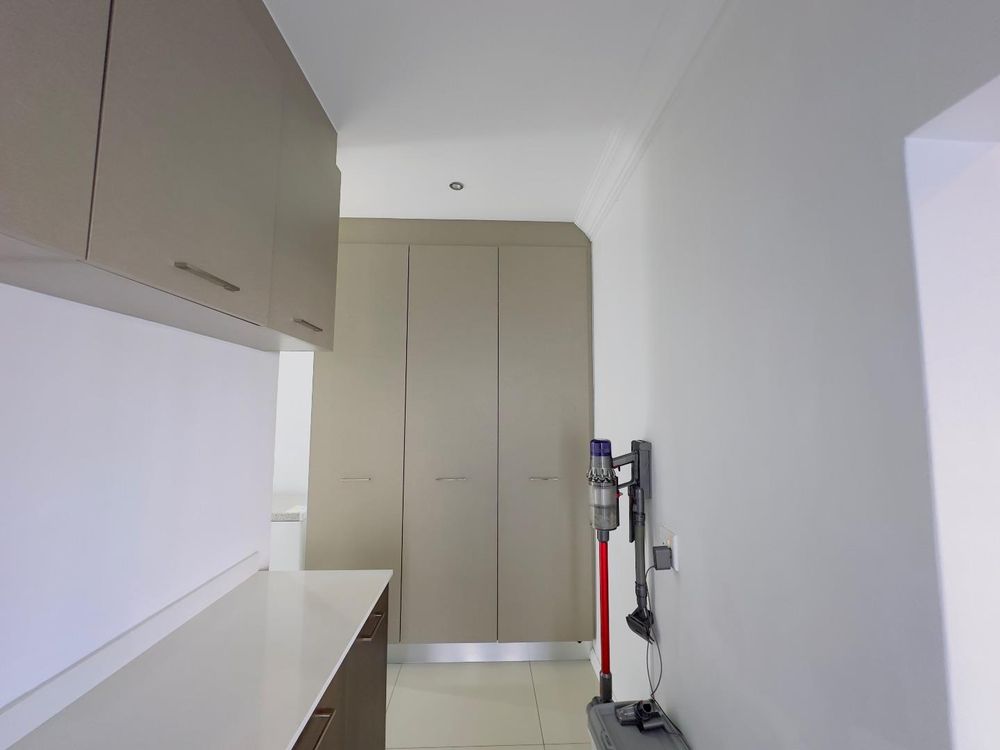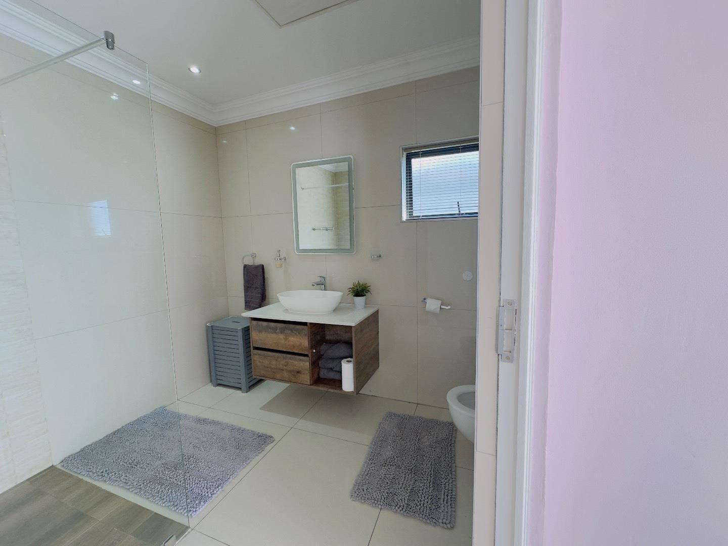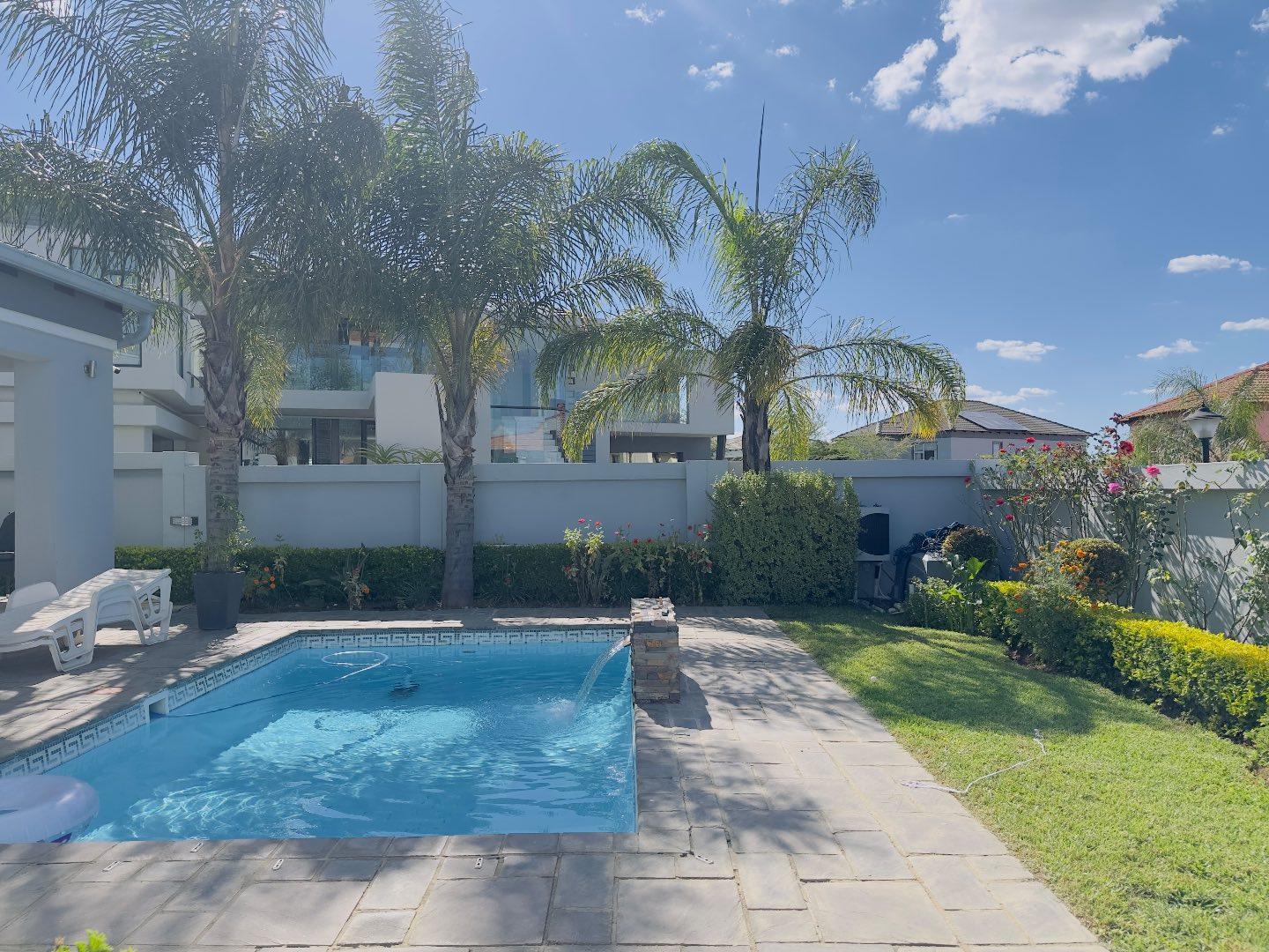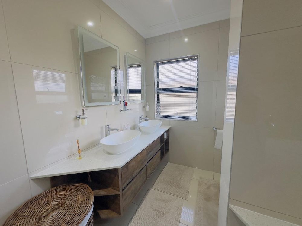The property is designed for lifestyle living and effortless entertaining. Enjoy a covered patio with built-in braai, overlooking a sparkling swimming pool fitted with a heat pump, surrounded by a beautifully landscaped garden. An upstairs balcony provides an additional tranquil retreat with elevated estate views.